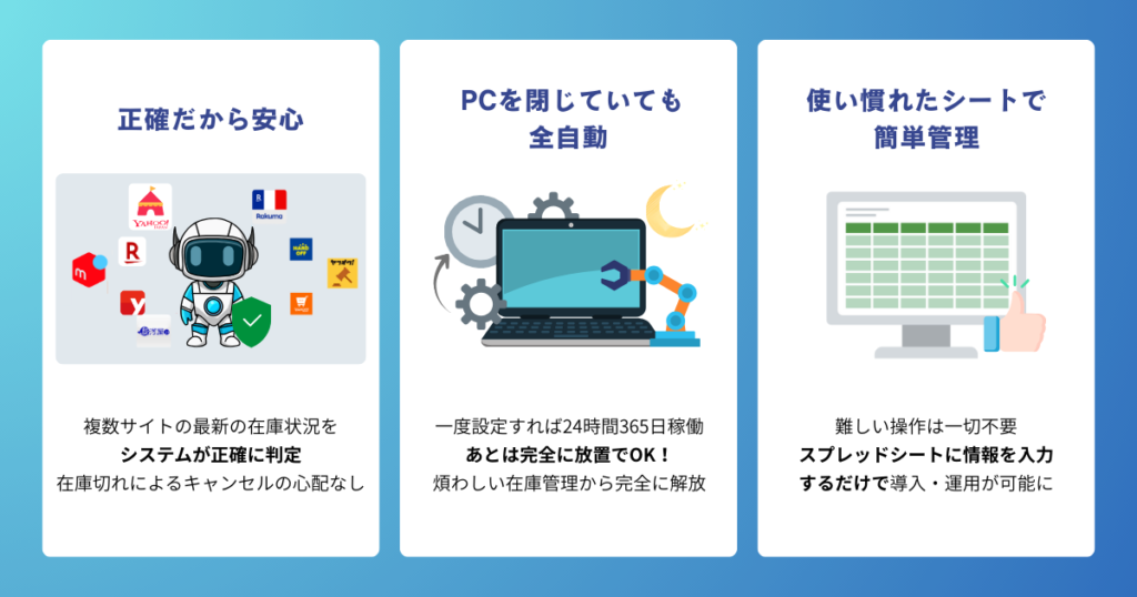 一度設定してしまえば、あとは完全に放置でOK。あなたがPCを見ていない時間も、システムは24時間365日、休むことなく働き続けます。まさに「あなただけの有能なアシスタント」として、在庫管理の煩わしさから解放します。